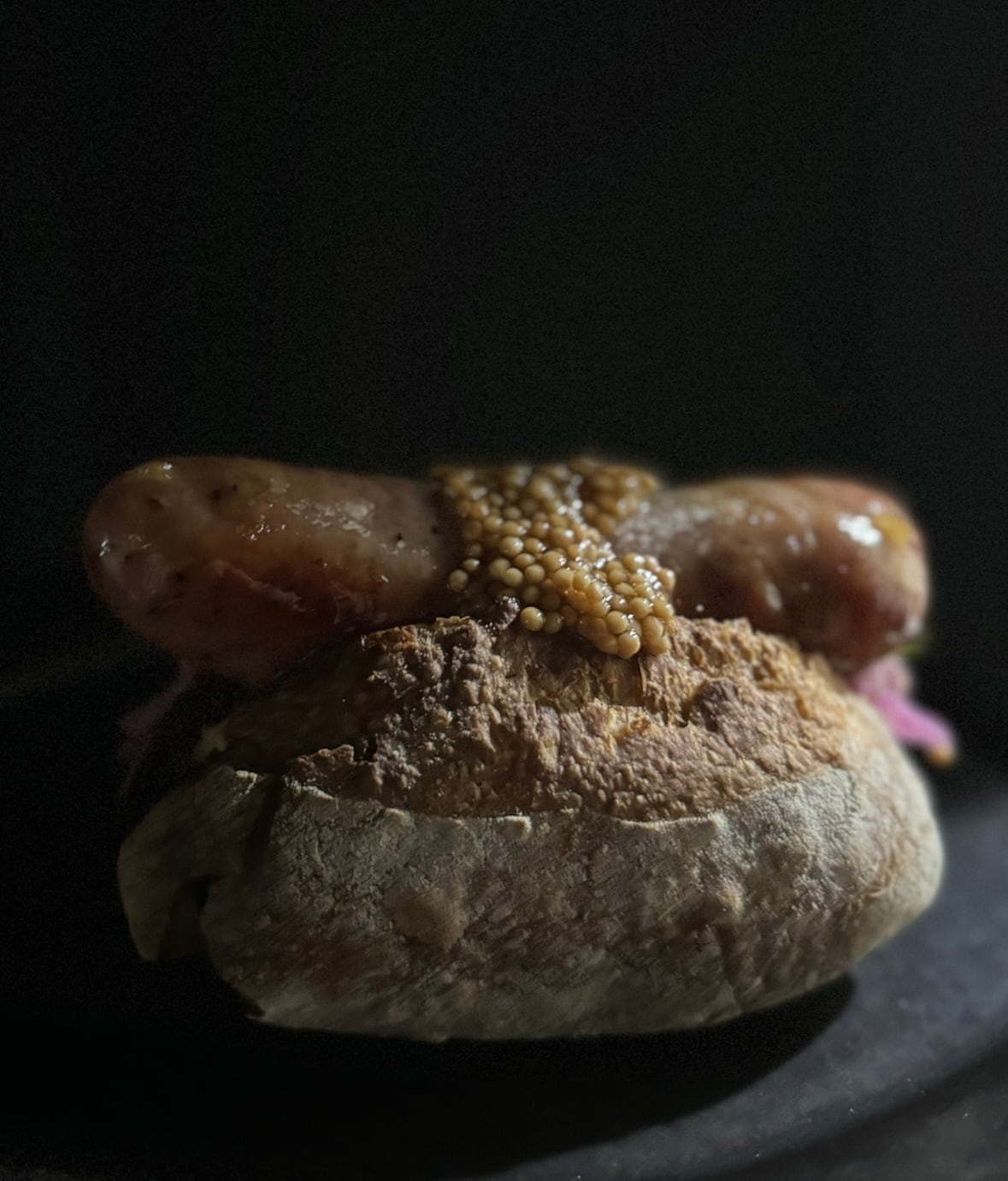 無添加ソーセージとキャベツのマリネにマスタードソースの特製ホットドック